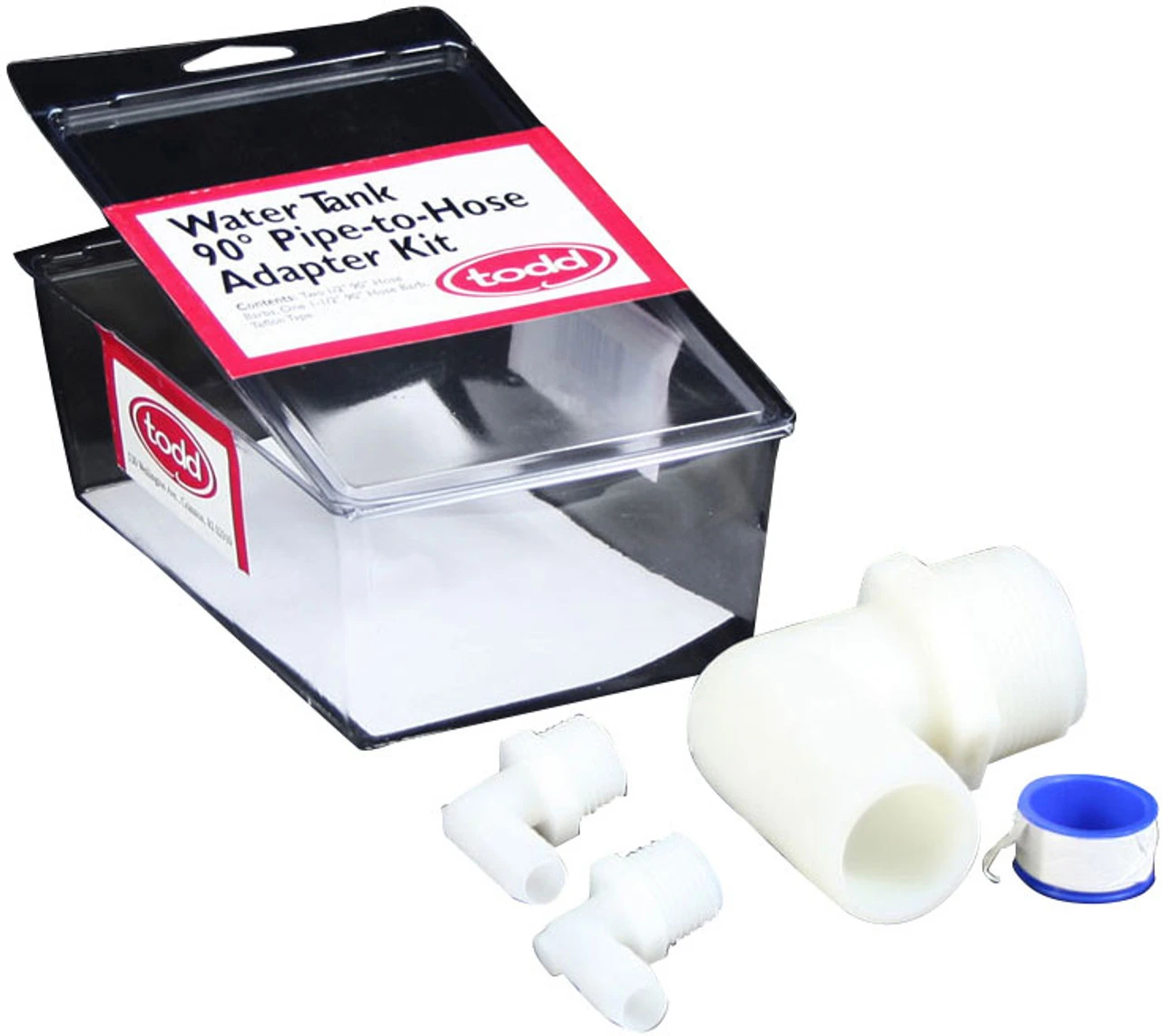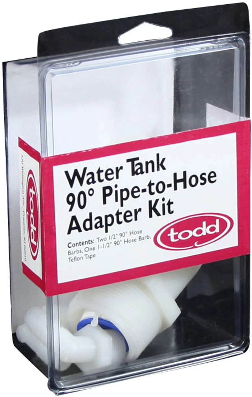 Todd 93-2223 Water Tank 90 Degree Pipe to Hose Adaptor for attaching hoses to a water or holding tank. The opposite end of the fitting accepts the hose. All kits include all fittings needed, and Teflon Tape for easy installation and tight fit.